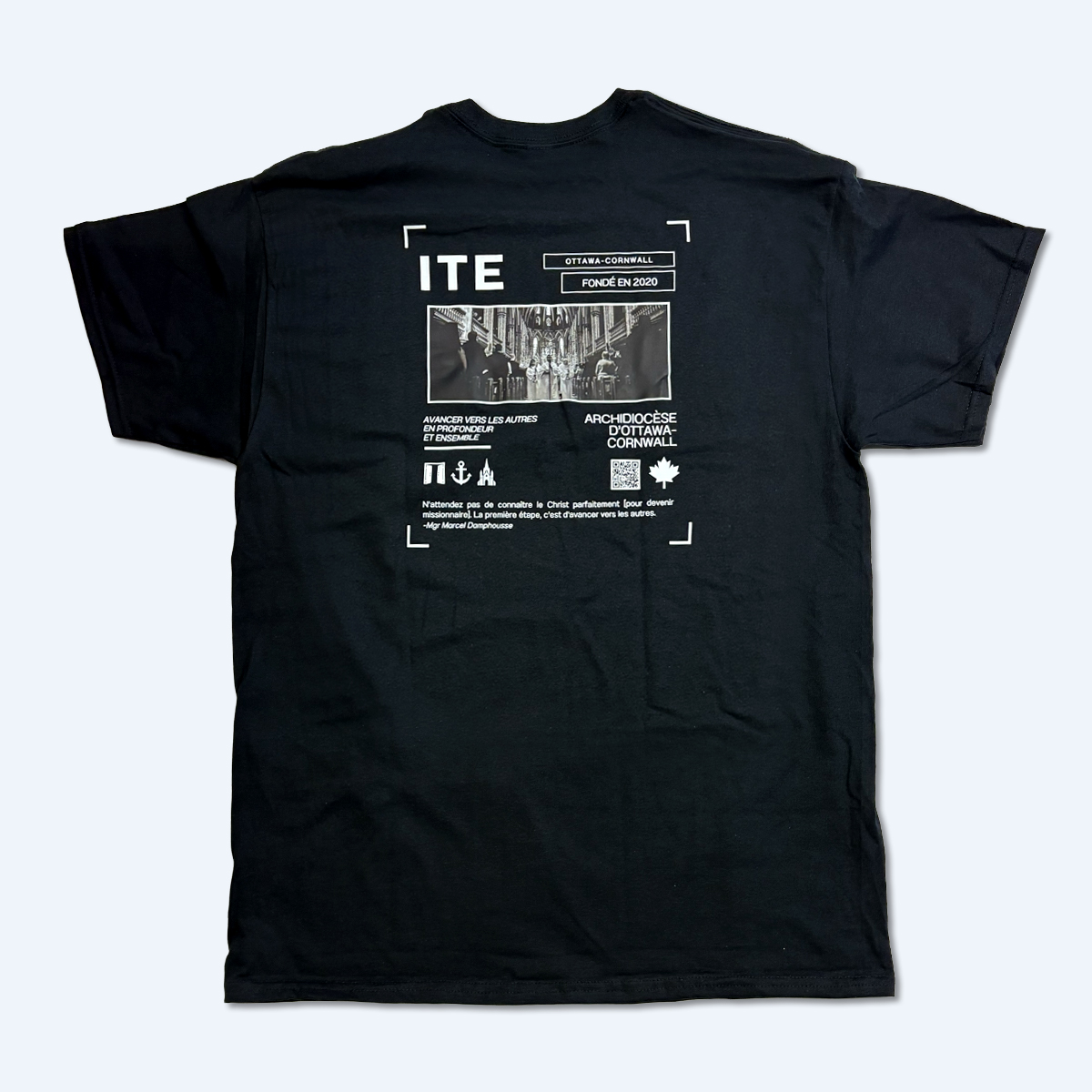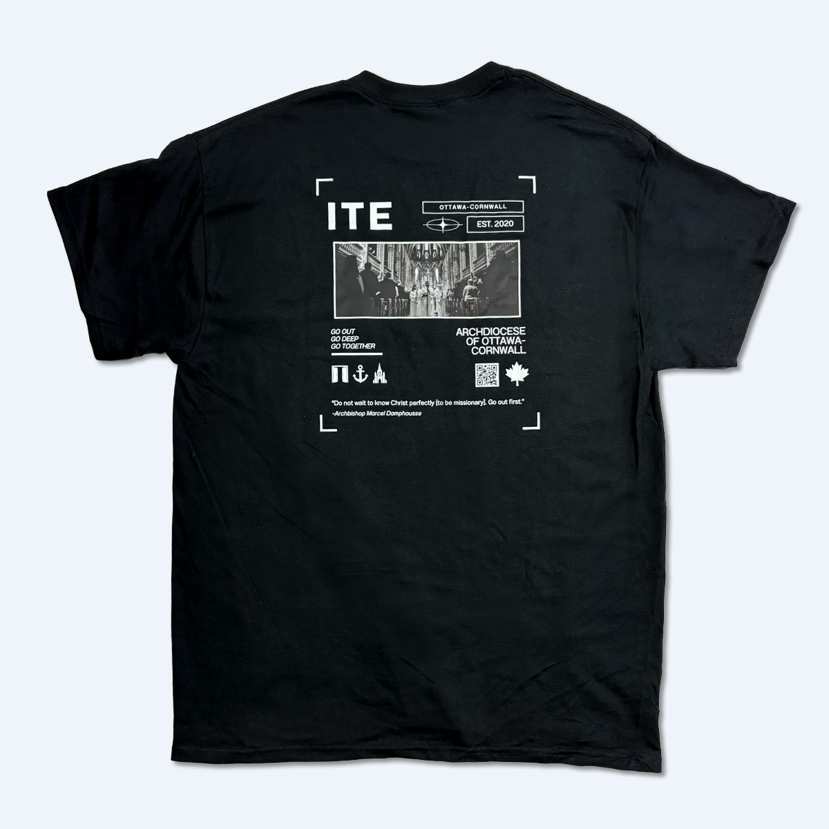 Rep the vision with our ITE t-shirt, inspired by Archbishop Damphousse’s words: “Do not wait to know Christ perfectly [to be missionary]. Go out first.”